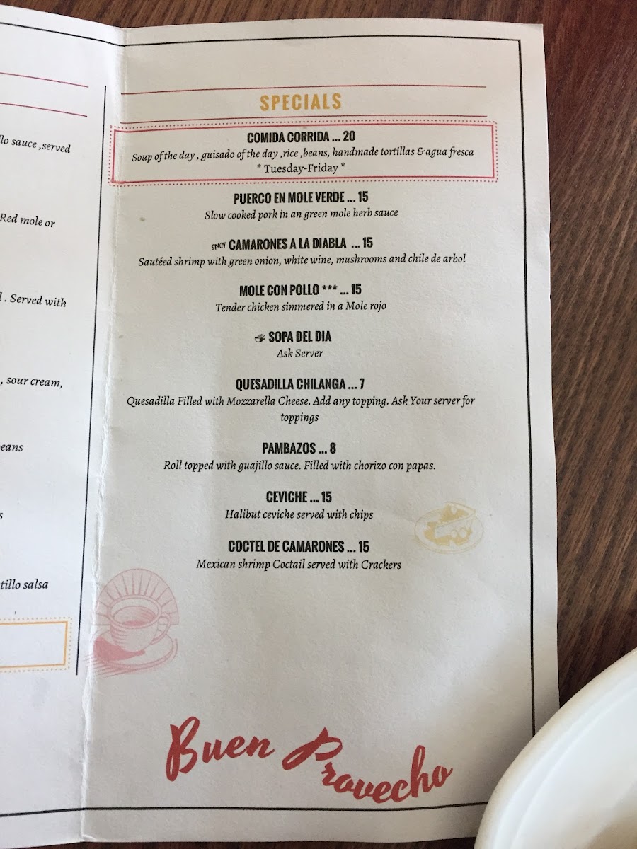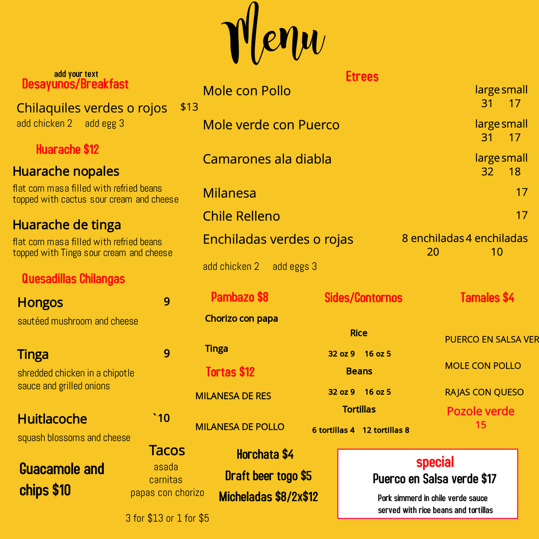 Tender Chicken simmered in a mole rojo sauce. Served with rice and beans and 2 tortillas *COINTAINS NUTS*