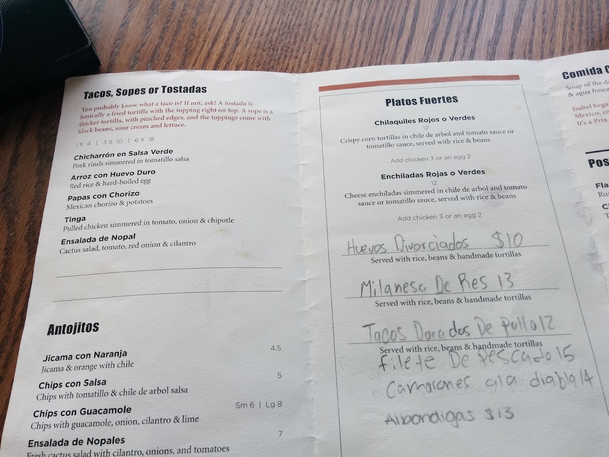 Thinly cut steak or chicken breast, breaded with bread crumbs and herbs, lightly fried. Served with rice and beans and 2 tortillas
